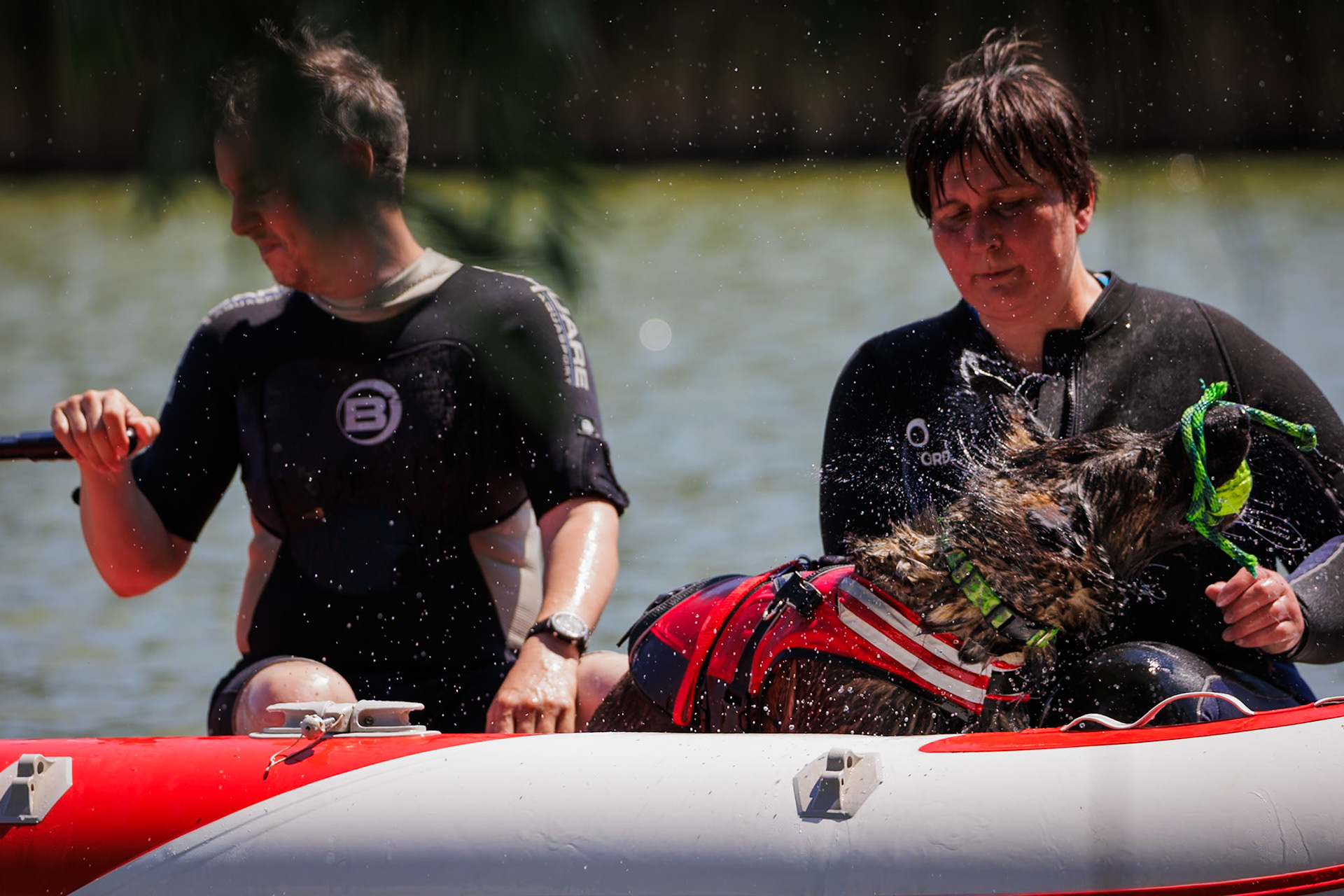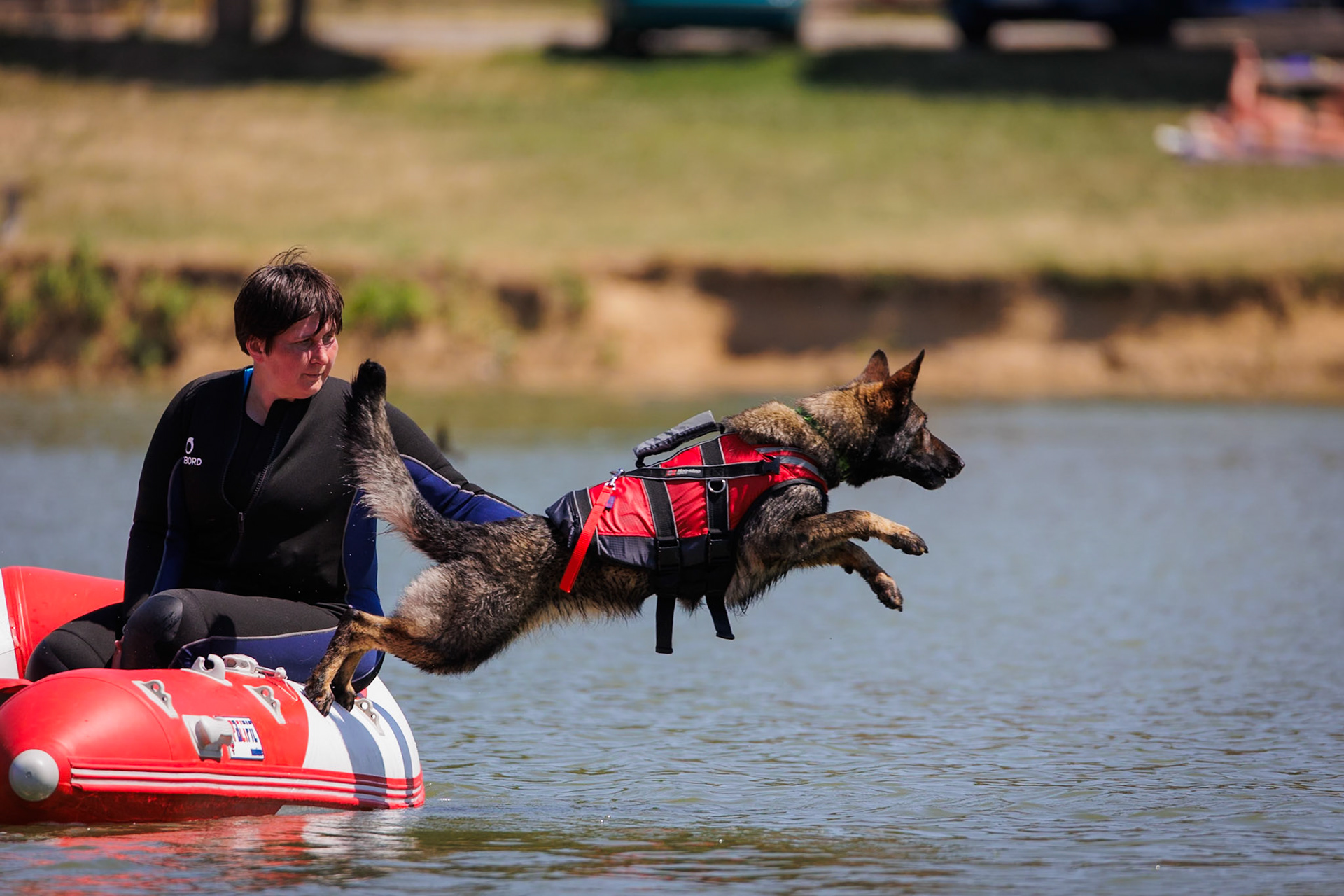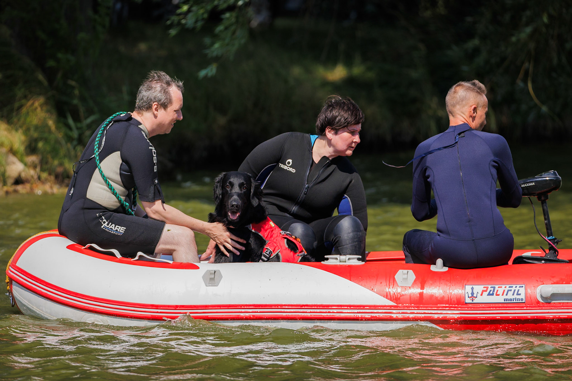 Skupinka psovodov z Jihomoravskej brigády kynológov na tréningu na vode.
