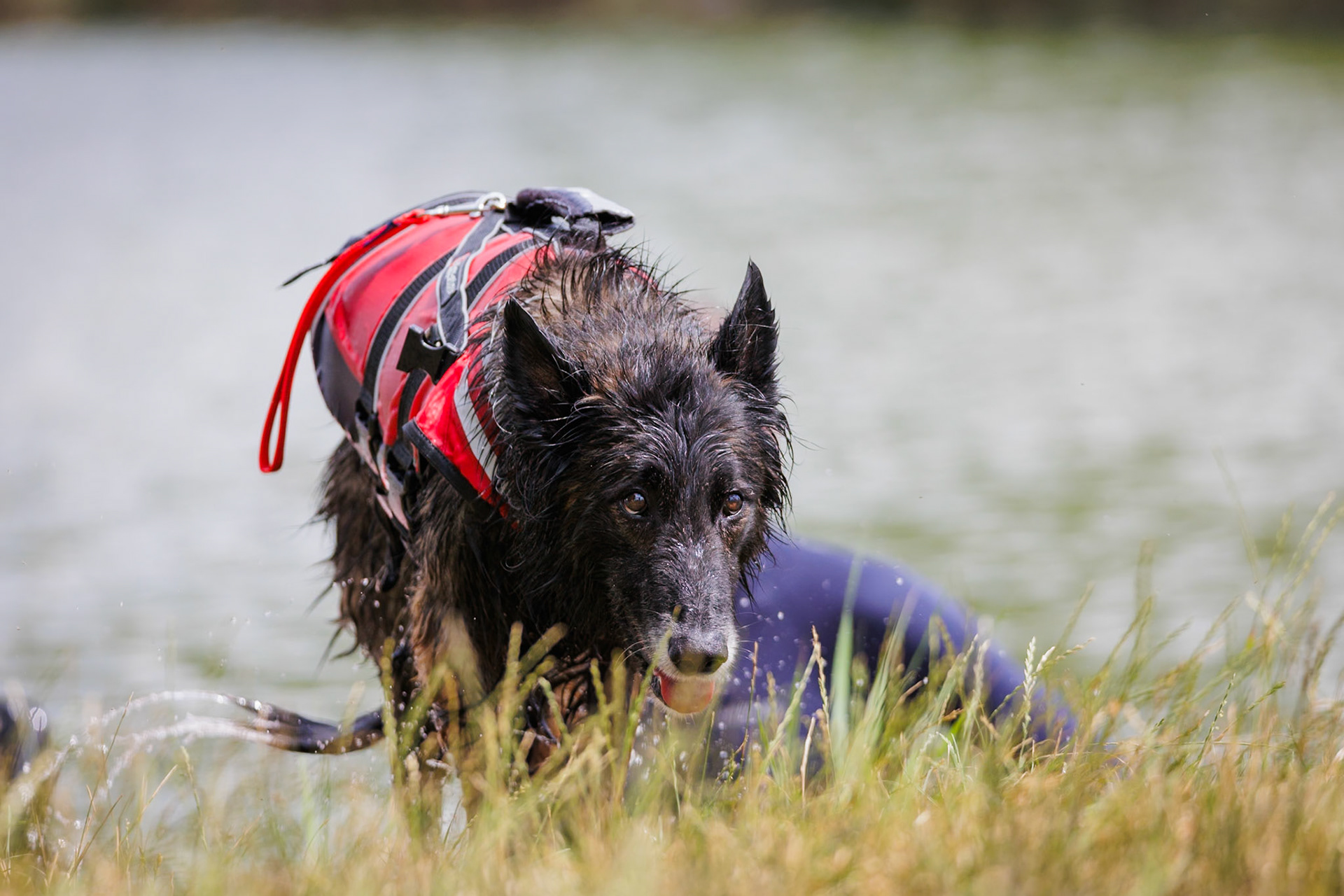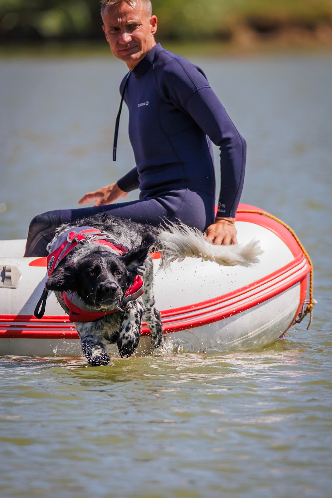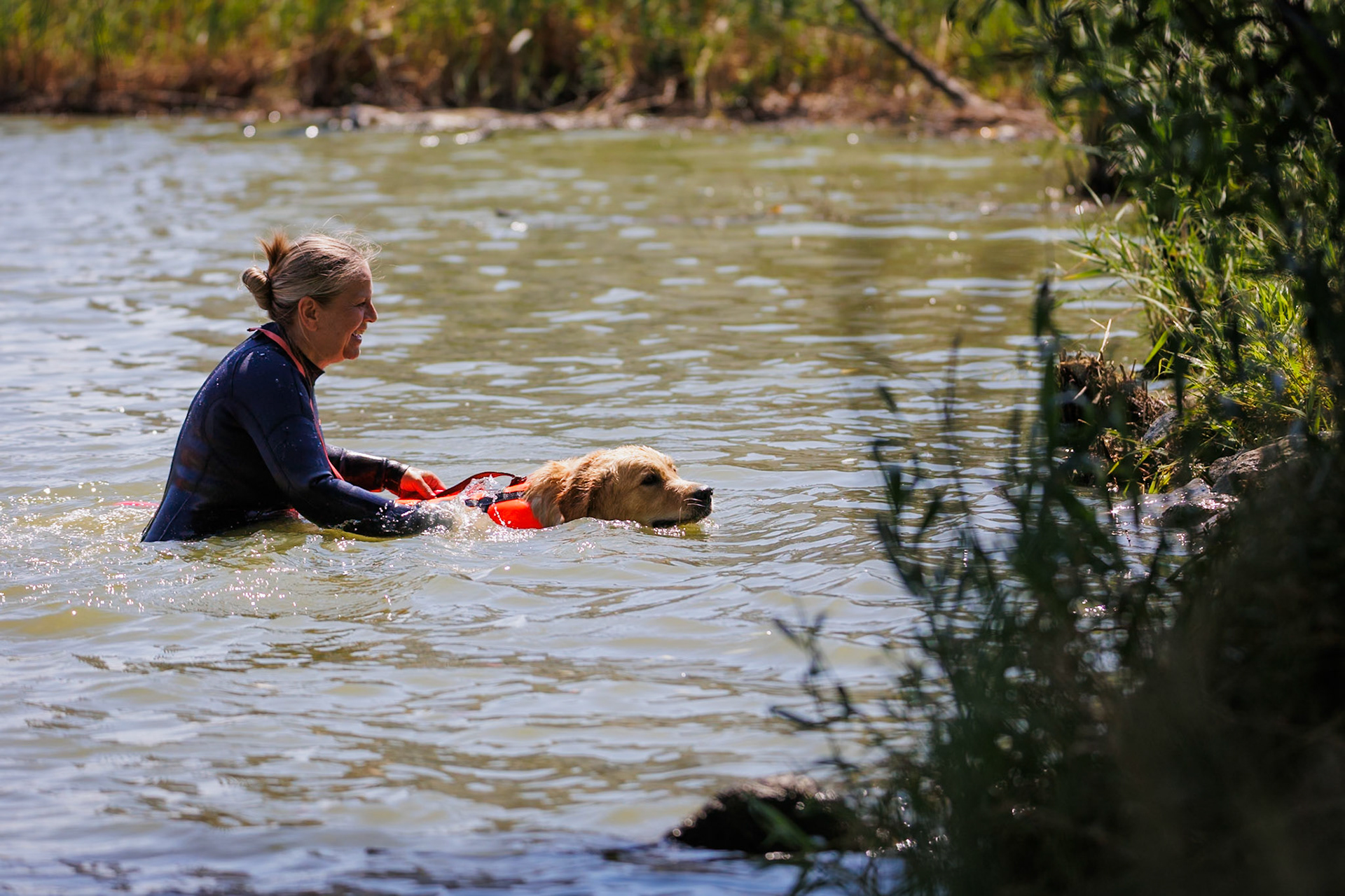 Skupinka psovodov z Jihomoravskej brigády kynológov na tréningu na vode.